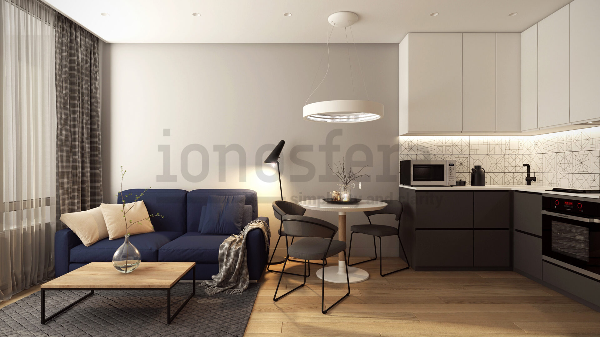 Студией называют квартиру, в которой одна или несколько комнат объединены в единое пространство. Современные новостройки, а также дома из категории вторичной недвижимости Киева, предлагают множество вариантов квартир студий с разной площадью. Может ли такая квартира быть уютной и комфортной? Да! Если дизайн квартиры студии доверен профессионалам нашей компании Ionosfera. Отличительная особенность студии заключается в гармоничном зонировании на одной площади гостиной, кухни и спальни.