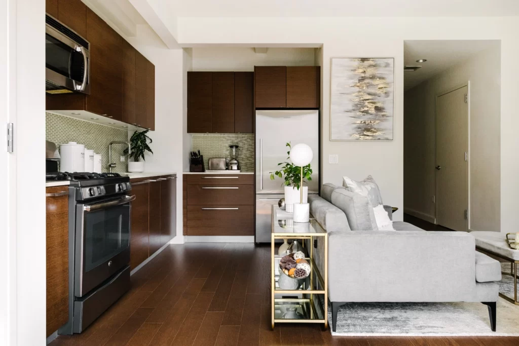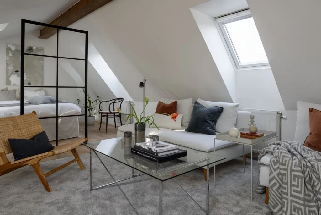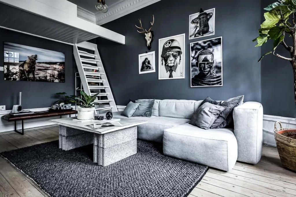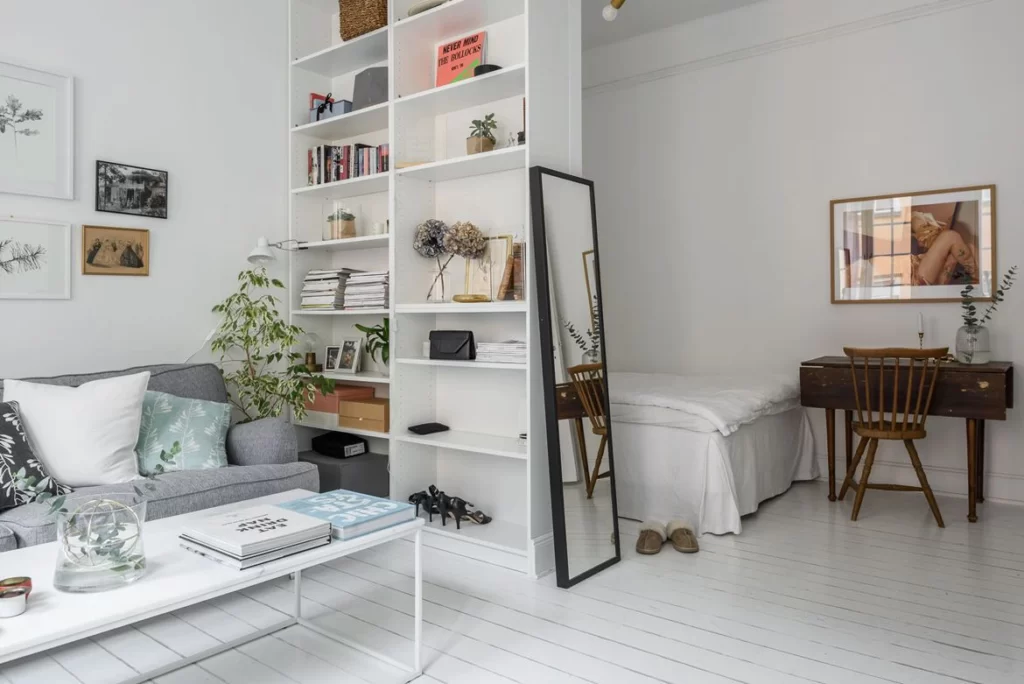 Зонирование выполняется соединением разных материалов отделки пола, обустройством ниш, перегородок различной конструкции. Также для выделения зон мы применяем предметы мебели — диван прямой модели, барная стойка, журнальный столик, кресла. Популярный прием — использование системы хранения для разделения зон спальной и гостиной. Еще один способ разделить пространство — освещение. Потолочные, напольные, настенные лампы и светильники помогают выполнить зонирование квартиры студии без необходимости установки громоздких предметов.